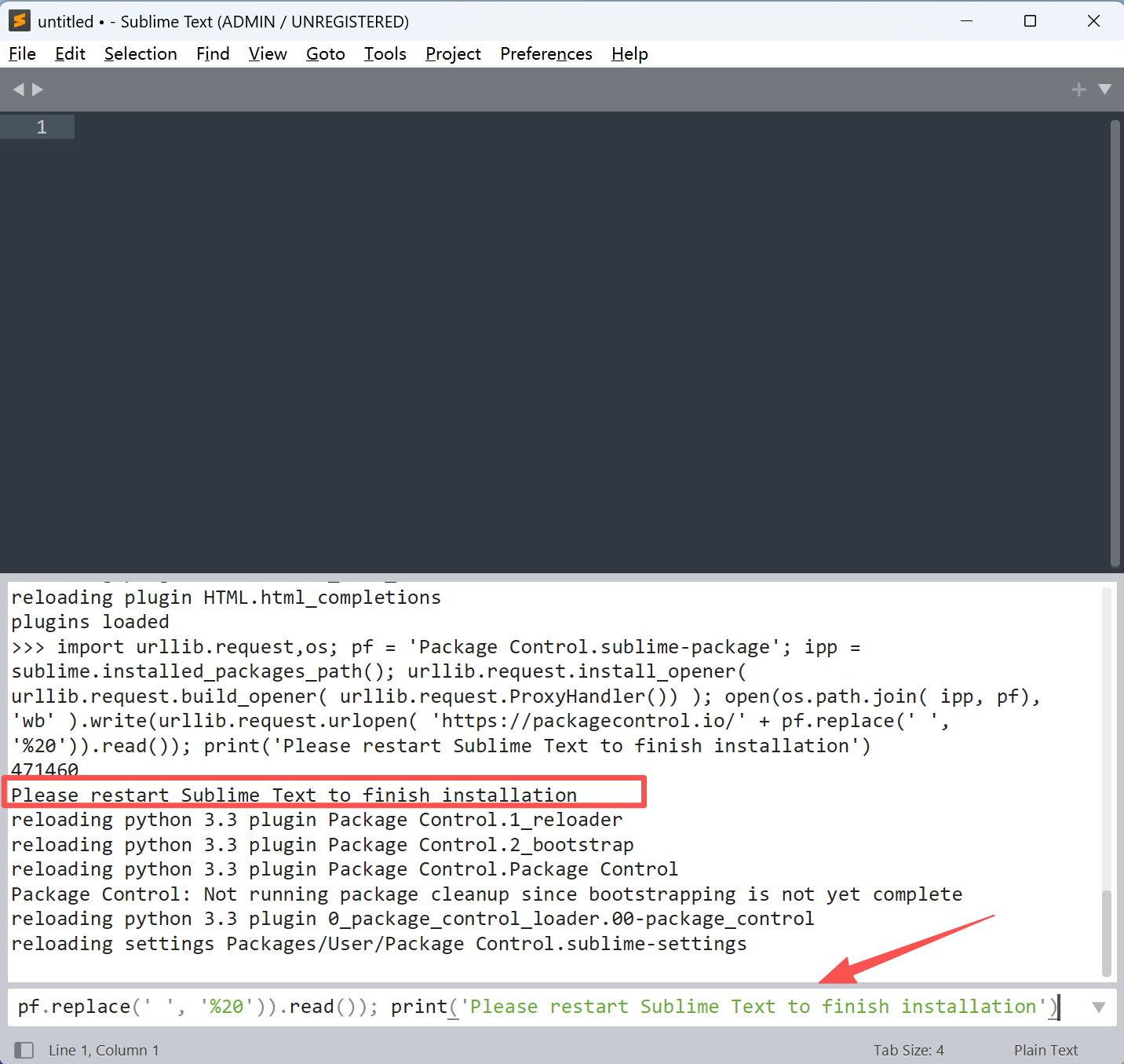 import urllib.request,os; pf = 'Package Control.sublime-package'; ipp = sublime.installed_packages_path(); urllib.request.install_opener( urllib.request.build_opener( urllib.request.ProxyHandler()) ); open(os.path.join( ipp, pf), 'wb' ).write(urllib.request.urlopen( 'https://packagecontrol.io/' + pf.replace(' ', '%20')).read()); print('Please restart Sublime Text to finish installation')